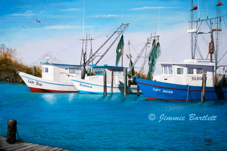 Jimmie is a painter. In the Etsy shop I have admired paintings of Texas scenes, floral including beautiful roses which is my favorite flower and sea side scenes. Can't you hear the sound of moving water, feel the warmth of the sun and smell the scent of salt air when looking at these boats?