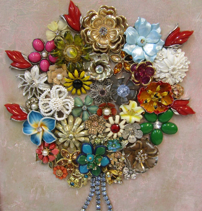 I first came across the work of Jimmie and Carolyn Bartlett on twitter. They followed me and I followed back. Carolyn does art pieces made from old jewelry and other found objects. Isn't this bouquet simple glorious?